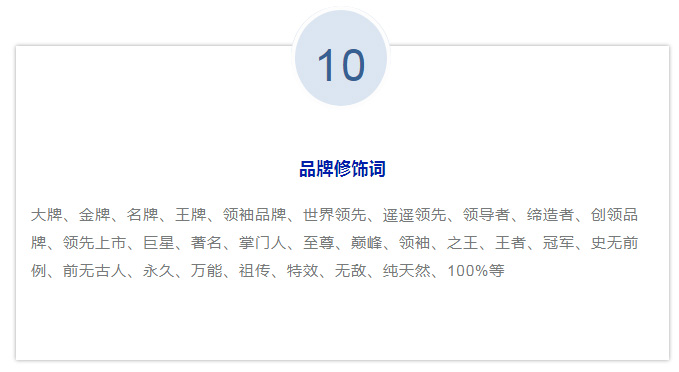 我們?cè)谥谱骶W(wǎng)站、小程序的商品標(biāo)題、頭圖、詳情頁(yè)、推文等商品信息的時(shí)候,除了制造賣點(diǎn)吸引消費(fèi)者外,還需要注意避開(kāi)一些廣告法禁止的宣傳用語(yǔ),避免中招。